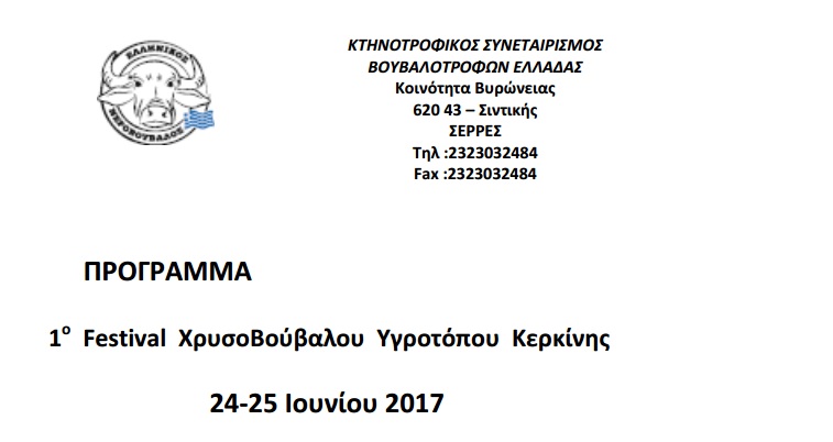 Ο Κτην. Συνεταιρισμός Βουβαλοτρόφων Ελλάδας με τον Φορέα Διαχείρισης Λίμνης Κερκίνης, τον Δήμο Ηράκλειας, τον Δήμο Σιντικής, το Κέντρο Γενετικής Βελτίωσης Zώων Νέας Μεσήμβριας Θεσσαλονίκης, το Εμπορικό Επιμελητήριο Σερρών κ.α., διοργανώνουν από 24-25 Ιουνίου το 1ο Festival ΧρυσοΒούβαλου Υγροτόπου Κερκίνης.